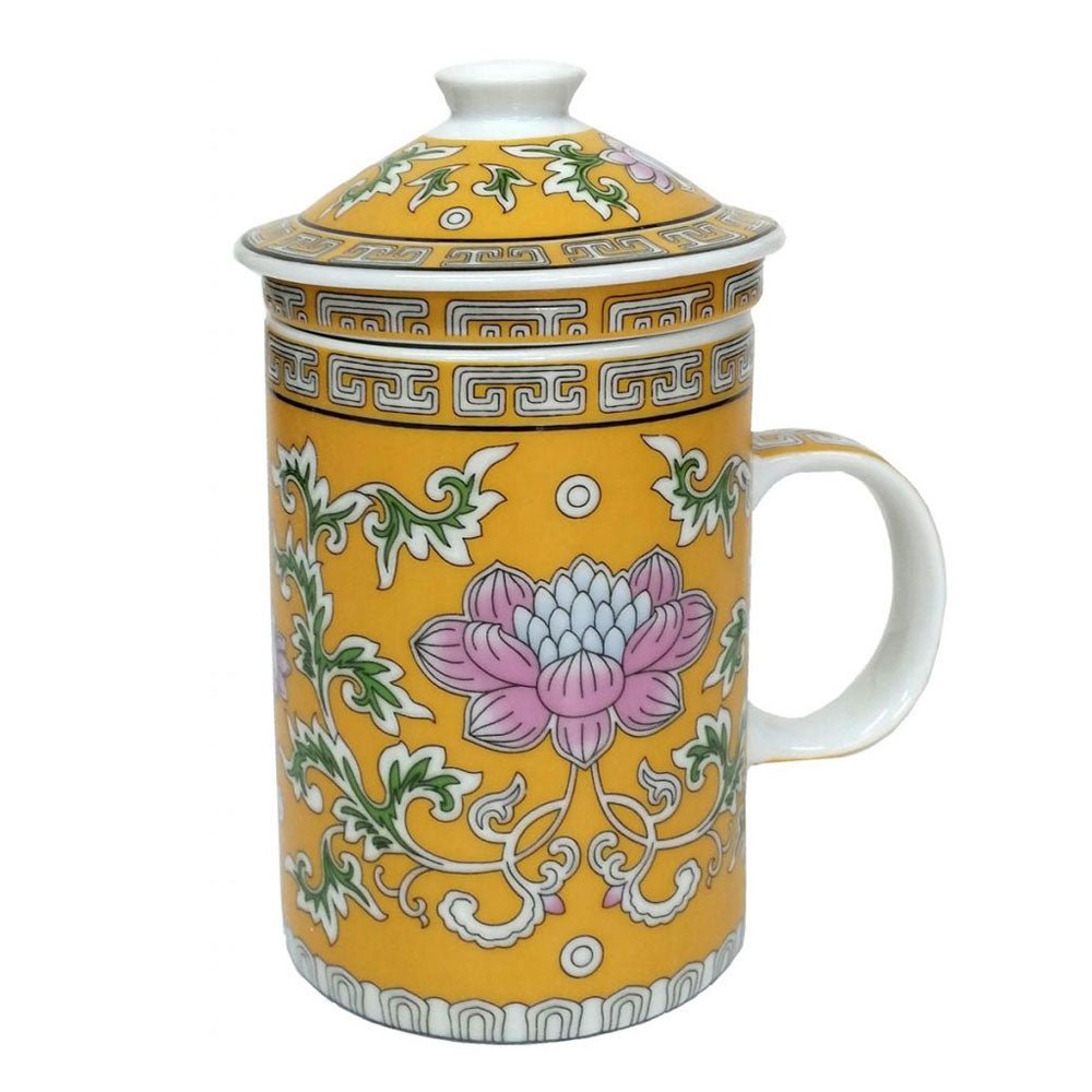 A beautiful Chinese tea mug with lotus flower design.Three piece includes the mug, lid and the tea strainer. Height: 14cmWeight: 530gShipping Weight: 580g